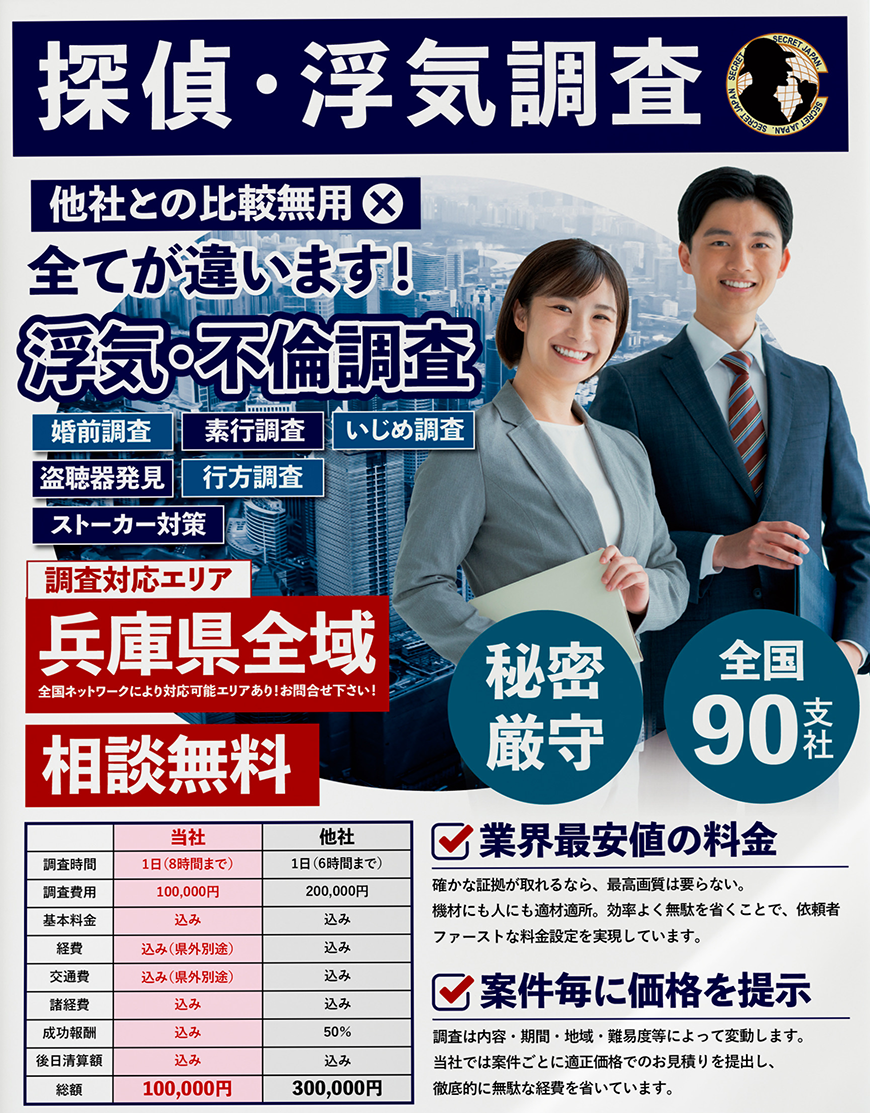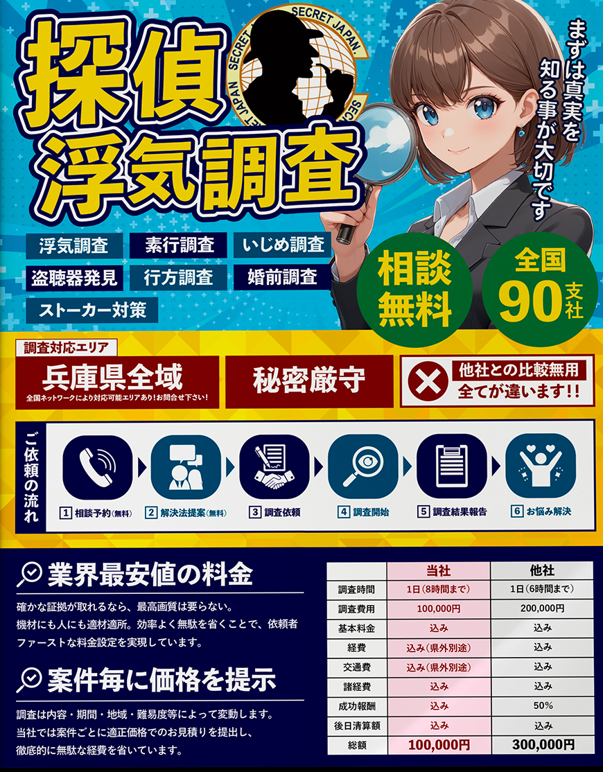 兵庫県で浮気調査をご検討中の方は、総合探偵社シークレットジャパン神戸関西本部までご相談ください。総合探偵社シークレットジャパン神戸関西本部は、神戸市を拠点に、西宮市や明石市、姫路市など兵庫県を中心に対応する探偵事務所です。お客様の不安を解消するため、透明性の高い料金体系と詳細なお見積り費用を提示し、安心してご依頼いただける体制を整えております。年間3,000件を超える解決実績を誇る専門家チームが、確かな技術とノウハウで法的に有効な証拠を収集します。まずは無料相談から、お気軽にお問い合わせください。あなたの未来を全力でサポートいたします。